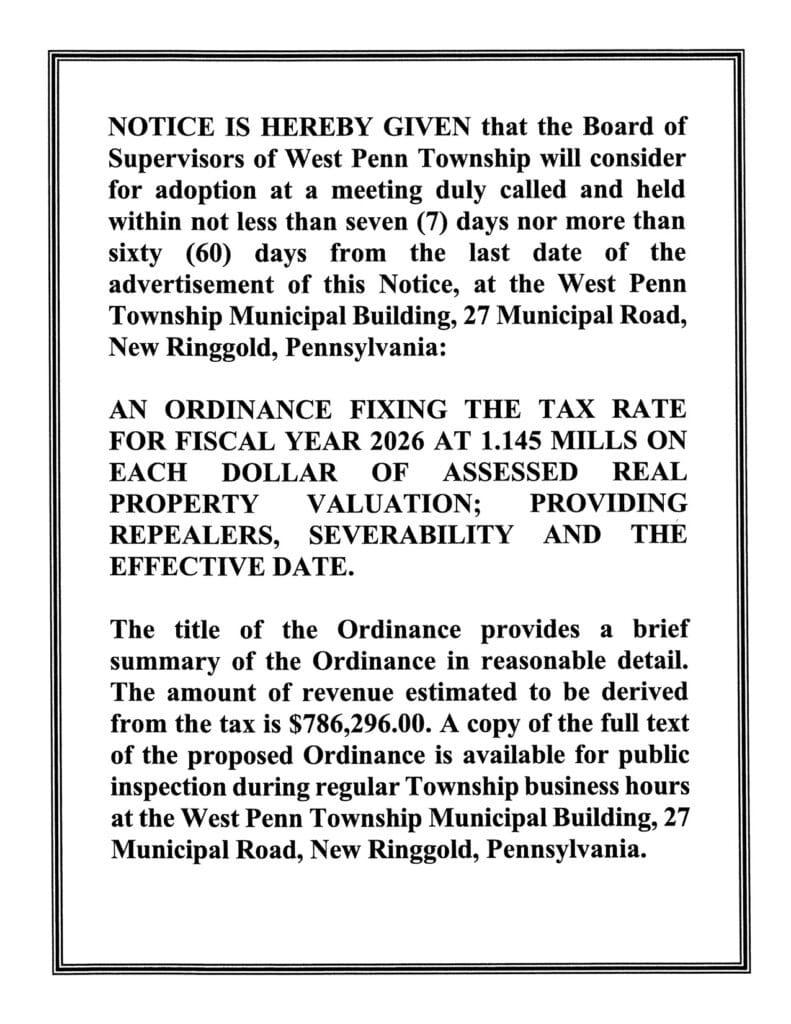 - West Penn Township will be closed Friday, Dec. 30th & Monday, Jan. 2, 2023.